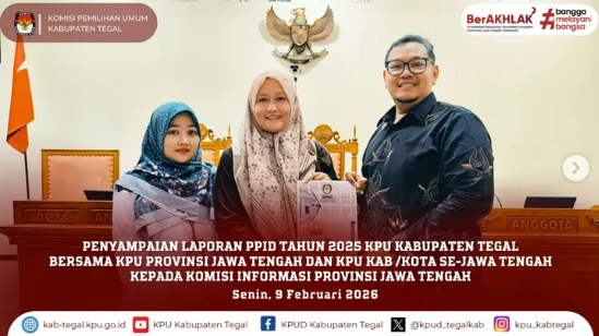 Slawi- Komisi Pemilihan Umum Kabupaten Tegal menyampaikan Laporan Pejabat Pengelola Informasi dan Dokumentasi (PPID) Tahun 2025 kepada Komisi Informasi Provinsi Jawa Tengah yang diagendakan secara serentak oleh KPU Provinsi Jawa Tengah bersama KPU Kabupaten/Kota se-Jawa Tengah pada Senin, 9 Februari 2026. Dalam kegiatan tersebut, KPU Provinsi Jawa Tengah diwakili oleh Ketua Divisi Sosialisasi, Pendidikan Pemilih, dan Partisipasi Masyarakat, Akmaliyah, menyampaikan sejumlah poin terkait pelaksanaan layanan informasi publik di lingkungan KPU se-Jawa Tengah. Akmaliyah menjelaskan bahwa tren saat ini terdapat peningkatan permohonan informasi publik dengan karakteristik serupa seperti ijazah terjadi di beberapa KPU Kabupaten/Kota. Kondisi tersebut menjadi perhatian bersama untuk memperkuat kesiapan dan kualitas pelayanan informasi publik di seluruh satuan kerja. Lebih lanjut disampaikan bahwa meskipun hingga saat ini belum terdapat informasi terkait pelaksanaan monitoring dan evaluasi keterbukaan informasi publik pada tahun berjalan, KPU Kabupaten/Kota tetap diminta untuk menjaga dan tidak mengurangi kualitas layanan informasi publik kepada masyarakat. Selain itu, seluruh jajaran KPU diharapkan terus meningkatkan pemahaman terkait kategori informasi publik sesuai dengan ketentuan peraturan perundang-undangan guna meminimalisir potensi sengketa informasi. Penyampaian Laporan PPID Tahun 2025 tersebut diterima oleh Ketua Komisi Informasi Provinsi Jawa Tengah, Indra Ashoka Mahendrayana, bersama Wakil Ketua Setiadi, serta Anggota Bidang Kelembagaan dan Monitoring Evaluasi, Ermy Sri Ardhyanti. Dalam kesempatan tersebut, Ketua Komisi Informasi Provinsi Jawa Tengah menyampaikan apresiasi atas penyampaian Laporan PPID Tahun 2025 yang dilakukan secara serentak dan lebih awal oleh KPU se-Jawa Tengah.(wn/hms) ....
