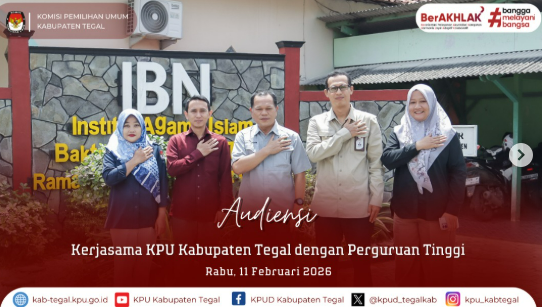 Slawi- KPU Kabupaten Tegal melaksanakan audiensi bersama Institut Agama Islam Bakti Negara (IBN) Tegal yang berlangsung di ruang rapat IBN pada Selasa 10 Februari 2026. Pertemuan tersebut dihadiri oleh Ketua dan Anggota KPU, serta Rektor dan Wakil Rektor IBN. Audiensi ini merupakan bagian dari rangkaian penjajakan dan penguatan kerja sama kelembagaan, khususnya dalam bidang pendidikan pemilih, pengembangan SDM, riset kepemiluan, serta program magang mahasiswa. Melalui pertemuan ini, kedua belah pihak berkomitmen membangun sinergi yang berkelanjutan guna mendukung penguatan demokrasi dan peningkatan partisipasi masyarakat. ....
