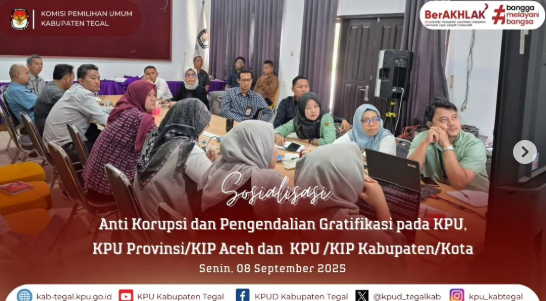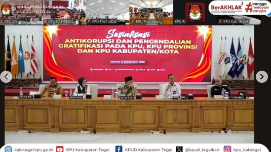 Slawi- KPU Kabupaten Tegal mengikuti kegiatan sosialisasi Anti Korupsi dan Pengendalian Gratifikasi yang diselenggarakan oleh KPU RI bersama KPU Provinsi/KIP Aceh serta KPU/KIP Kabupaten/Kota se-Indonesia dengan menghadirkan Nara sumber dari Komisi Pemberantasan Korupsi, Senin (08 September 2025),