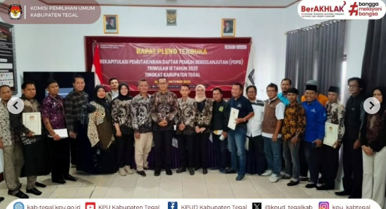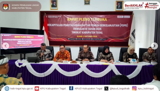 KPU Kabupaten Tegal menetapkan Rekapitulasi Pemutakhiran Data Pemilih Berkelanjutan (PDPB) Triwulan 3 Tahun 2025 sebanyak 1.286.323 dengan rincian Pemilih Laki-laki 650.285 dan Pemilih Perempuan 636.038 yang tersebar di 18 Kecamatan, 287 desa dan kelurahan.