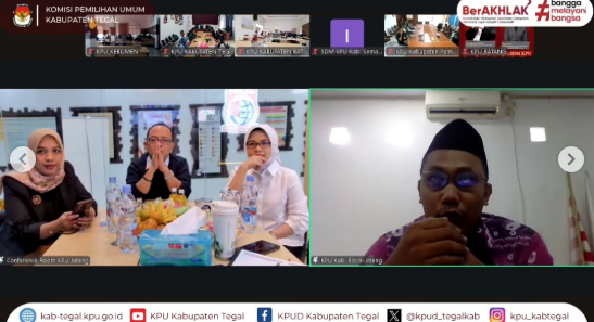 Komisioner, Sekretaris, para Kasubag, serta jajaran Staf Sekretaria KPU Kabupaten Tegal mengikuti kegiatan ini secara daring di Ruang Rapat KPU Kabupaten Tegal.