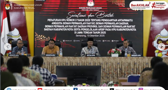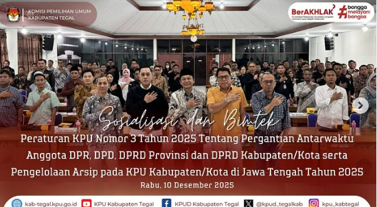 Slawi- Ketua dan Anggota KPU Kabupaten Tegal Divisi Teknis Penyelenggara serta Kasubag TPPH mengikuti Kegiatan Sosialisasi dan Bimbingan Teknis Peraturan KPU Nomor 3 Tahun 2025 tentang Penggantian Antarwaktu Anggota DPR, DPD, DPRD Kabupaten/Kota dan Pengelolaan Arsip yang diselenggarakan oleh KPU Provinsi Jawa Tengah pada Rabu, 10 Desember 2025.