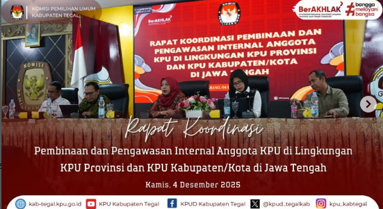 Slawi- Anggota KPU Kabupaten Tegal Divisi Sosdiklih Parmas dan SDM, Divisi Hukum dan Pengawasan serta Kasubag Parmas dan SDM menghadiri kegiatan Rapat Koordinasi Pembinaan dan Pengawasan Internal, Anggota KPU Provinsi dan KPU Kabupaten/Kota yang digelar oleh KPU Provinsi Jawa Tengah di Ruang Aula KPU Provinsi Jawa Tengah pada Kamis, 4 Desember 2025.