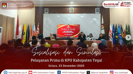 Slawi- KPU Kabupaten Tegal mengadakan Sosialisasi dan Simulasi Pelayanan Prima di Lingkungan KPU Kabupaten Tegal yang diikuti oleh seluruh pegawai, Selasa (23/12/2025),