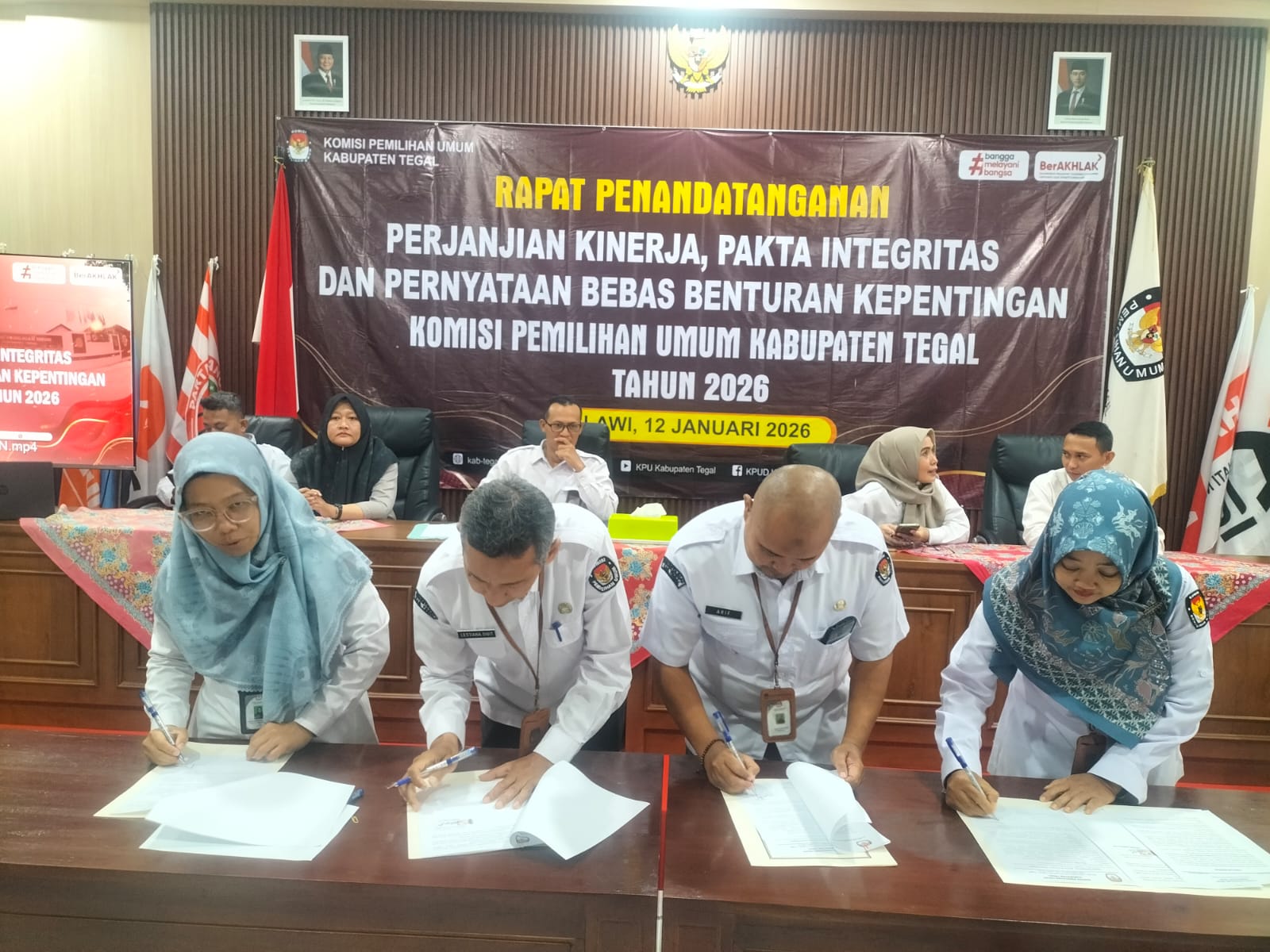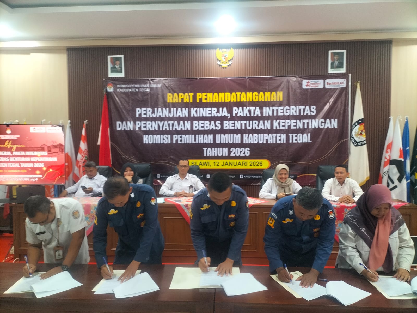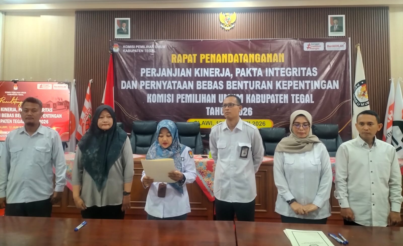 Slawi- Dalam rangka memperkuat budaya integritas, profesionalisme, dan akuntabilitas di lingkungan KPU, KPU Kabupaten Tegal menyelenggarakan kegiatan Penandatanganan Pakta Integritas, Perjanjian Kinerja, dan Pernyataan Bebas Benturan Kepentingan, Senin (5/1/2026).