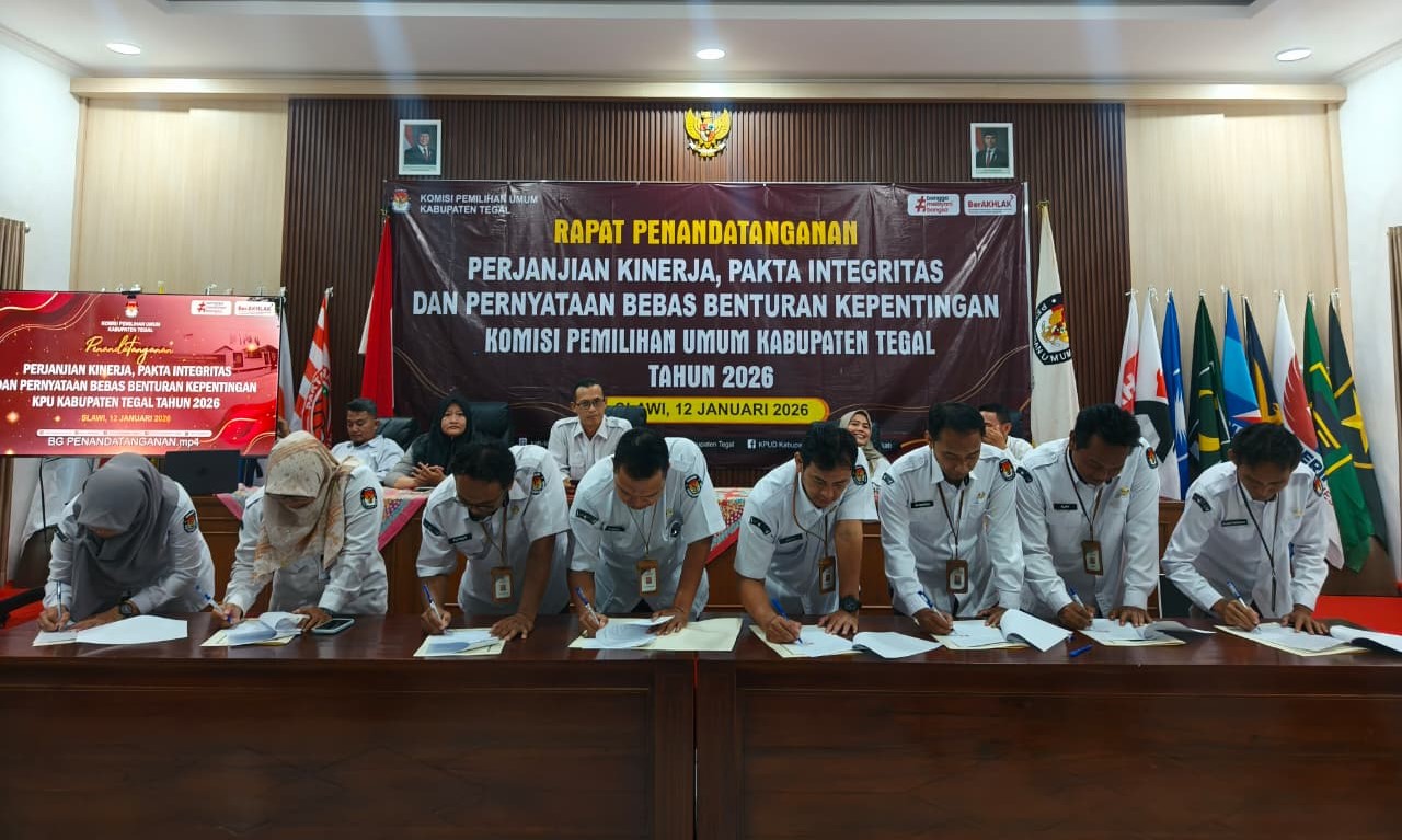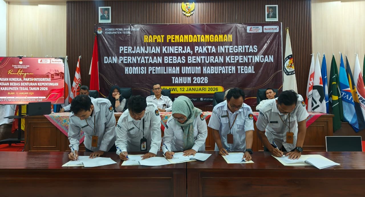 Penandatanganan Pakta Integritas, Perjanjian Kerja dan Pernyataan Bebas Benturan Kepentingan yang dilaksanakan pada awal tahun 2026 ini menjadi momentum penting bagi KPU Kabupaten Tegal untuk melakukan refleksi dan konsolidasi internal. Awal tahun dipandang sebagai waktu yang tepat untuk meneguhkan kembali nilai-nilai dasar aparatur KPU, sekaligus menyelaraskan target kinerja individu dan satuan kerja dengan kebijakan KPU RI.