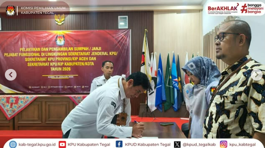 Slawi- Tiga pegawai ASN KPU Kabupaten Tegal mengikuti pelantikan serta pengambilan sumpah/janji Pejabat Fungsional Penata Kelola Pemilihan Umum di lingkungan Sekretariat Jenderal KPU, Sekretariat KPU Provinsi/KIP Aceh, dan Sekretariat KPU/KIP Kabupaten/Kota Tahun 2026 secara daring bertempat di Aula KPU Kabupaten Tegal pada Kamis (22/01/2026).