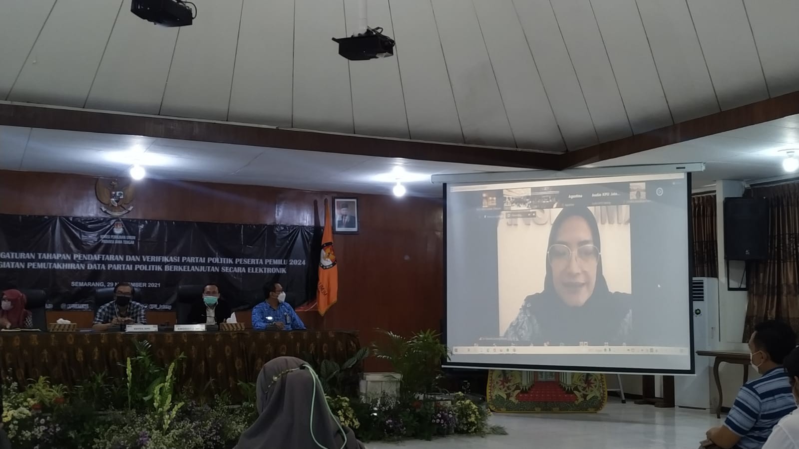 Slawi, kab-tegal.kpu.go.id - Rabu (29/11), KPU Kabupaten Tegal mengikuti Sosialisasi Rencana Pengaturan Tahapan Pendaftaran dan Rencana Verifikasi Partai Politik Peserta pemilu 2024 serta rencana Pemutakhiran Data partai Politik Berkelanjutan Secara Elektronik.yang diselenggarakan oleh KPU Provinsi Jawa Tengah. Sosialisasi kali ini dilakukan secara Hibrid dengan tetap mematuhi protokol kesehatan, bertempat di AULA KPU Provinsi Jawa Tengah, dan dihadiri oleh Partai Peserta Pemilu 2019, Partai Baru, Anggota KPU Kab/Kota Divisi Teknis Penyeenggaraan Pemilu dan Hukum Se Provinsi Jawa Tengah, sedangkan nara sumber hadir secara daring.