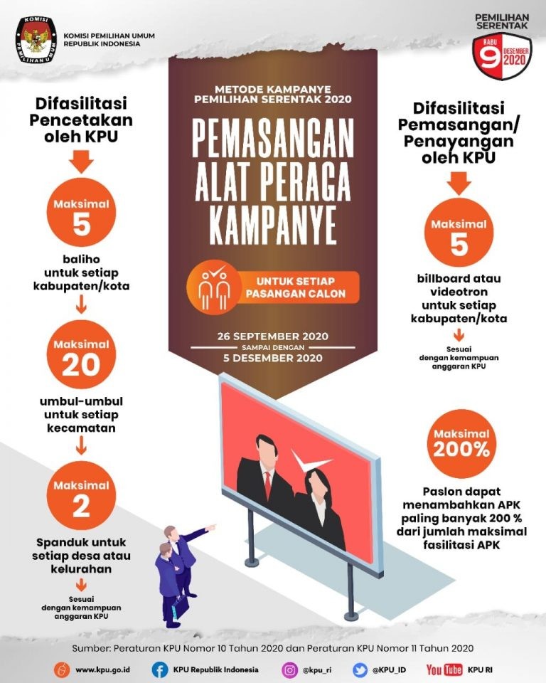 Slawi – Metode kampanye #Pemilihan2020 Pemasangan alat peraga kampanye difasilitasi pemasangan/penayangan dan pencetakannya oleh KPU yang diatur dalam Peraturan KPU No 10 dan 11 Tahun 2020. untuk lebih mudahnya dapat dilihat dalam info grafis berikut ini. (Fas)