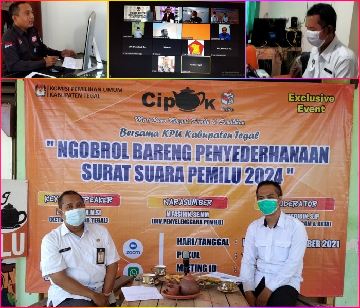 Slawi, kab-tegal.kpu.go.id - Senin (09/09) pukul 10.00 WIB, KPU Kabupaten Tegal kembali gelar Cipok PePe (Moci Karo Ndopok Pemilu dan Pemilihan) episode ke-2 yang berjudul "Sosialisasi Penyederhanaan Surat Suara Pemilu 2024" melalui aplikasi zoom meeting maupun kanal youtube KPU Kabupaten Tegal. Acara ini dihadiri oleh Seluruh Pimpinan Partai politik Peserta Pemilu 2021 dan Bawaslu Kabupaten Tegal.