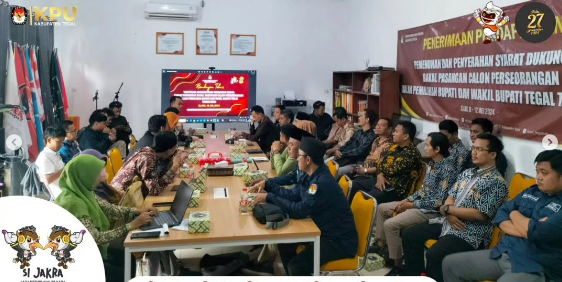 Slawi- Komisi Pemilihan Umum (KPU) Kabupaten Tegal melaksanakan Bimbingan Teknis Verifikasi Administrasi Perbaikan Kedua Syarat Dukungan Bakal Pasangan Calon Perseorangan Dalam Pemilihan Bupati dan Wakil Bupati Tegal Tahun 2024 di Ruang RPP Kantor KPU Kabupaten Tegal, Jl. Ade Irma Suryani No.2 Slawi, Selasa (18/07/2024).
