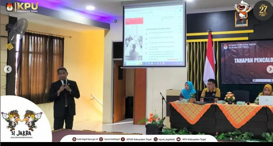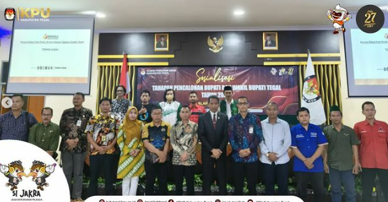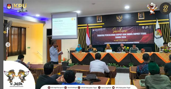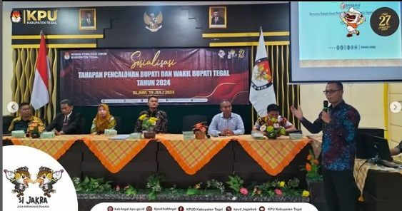 Slawi- Komisi Pemilihan Umum (KPU) Kabupaten Tegal menggelar kegiatan sosialisasi Tahapan Pencalonan Bupati dan Wakil Bupati Tegal Tahun 2024 di Gedung Bakti Husada, Slawi, Jumat (19/07/2024).