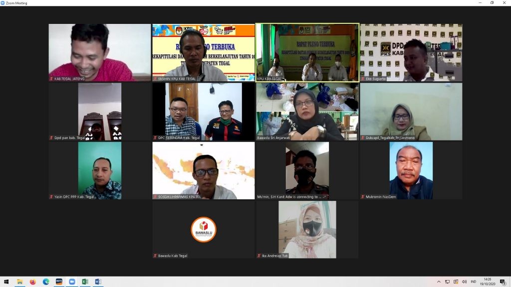 Slawi – Pada hari senin, tanggal sembilan belas bulan oktober tahun dua ribu dua puluh pukul 14.00 WIB KPU Kabupaten Tegal kembali melaksanakan Rapat Pleno Rekapitulasi Pemutakhiran Data Pemilih Berkelanjutan periode bulan Agustus Tahun 2020 melalui Aplikasi Zoom Meeting, hal ini dikarenakan perkembangan Covid-19 wilayah Kabupaten Tegal masih belum masuk zona hijau. Rapat pleno dipimpin langsung oleh ketua KPU Kabupaten Tegal, Bp. Nurokhman beserta komisioner KPU Kabupaten Tegal. Hadir dalam acara ini Anggota Bawaslu, Polres, Kodim 0712, Disdukcapil, segenap pimpinan partai politik peserta pemilu 2019 Kabupaten Tegal.