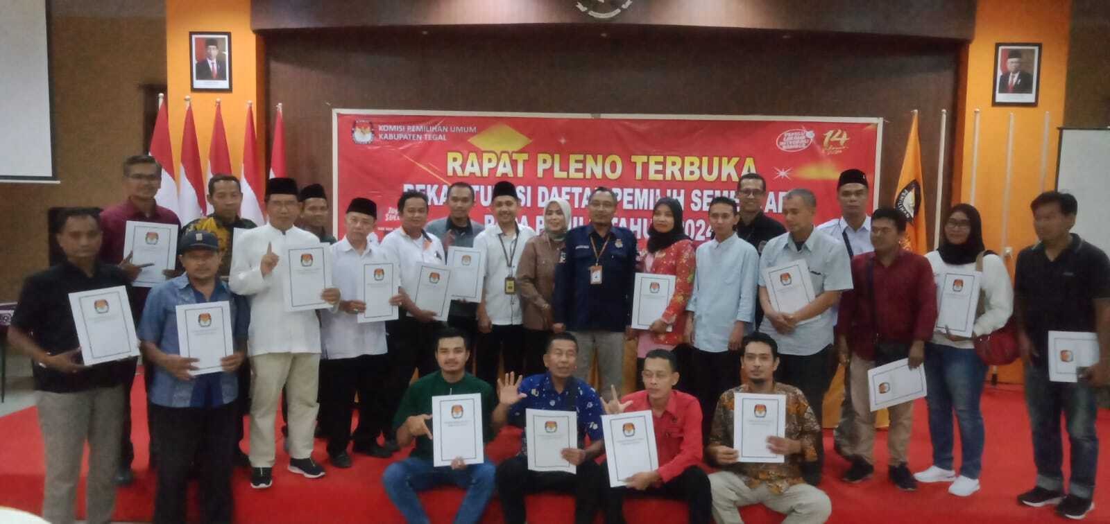 Slawi- Komisi Pemilihan Umum (KPU) Kabupaten Tegal menggelar rapat pleno terbuka rekapitulasi Daftar Pemilih Sementara (DPS) pada Pemilihan Umum Tahun 2024, di Gedung Pertemuan PMI Kabupaten Tegal, Rabu (05/04/2023)
