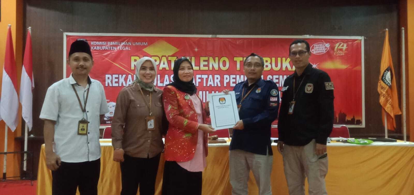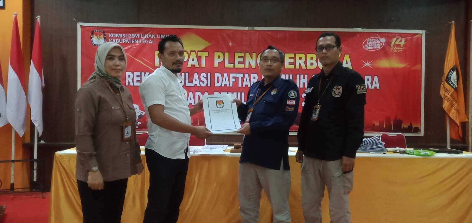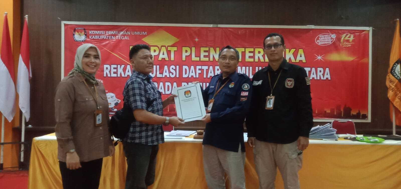 Selanjutnya pembacaan rekapitulasi oleh Divisi Perencanaan Data dan Informasi KPU Kabupaten Tegal, Adi Purwanto. Berdasarkan hasil rekapitulasi, jumlah TPS di seluruh Kabupaten Tegal 4.684, total DPS 1.247.540, terdiri 631.758 pemilih laki-laki dan 615.782 pemilih perempuan.