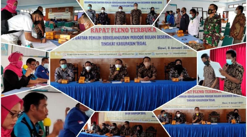 Slawi – KPU Kabupaten Tegal kembali melaksanakan Rapat Pleno Rekapitulasi Pemutakhiran Data Pemilih Berkelanjutan periode bulan Desember Tahun 2020 pada hari Jum’at tanggal delapan bulan Januari tahun Dua Ribu Dua Puluh Satu pukul 09.30 WIB bertempat di Gedung PKK Slawi. Rapat pleno dipimpin langsung oleh ketua KPU Kabupaten Tegal, Bp. Nurokhman beserta segenap Komisioner KPU Kabupaten Tegal. Hadir dalam acara ini Anggota Komisioner Bawaslu, Polres, Kodim 0712, Disdukcapil, segenap pimpinan partai politik peserta pemilu 2019 Kabupaten Tegal.