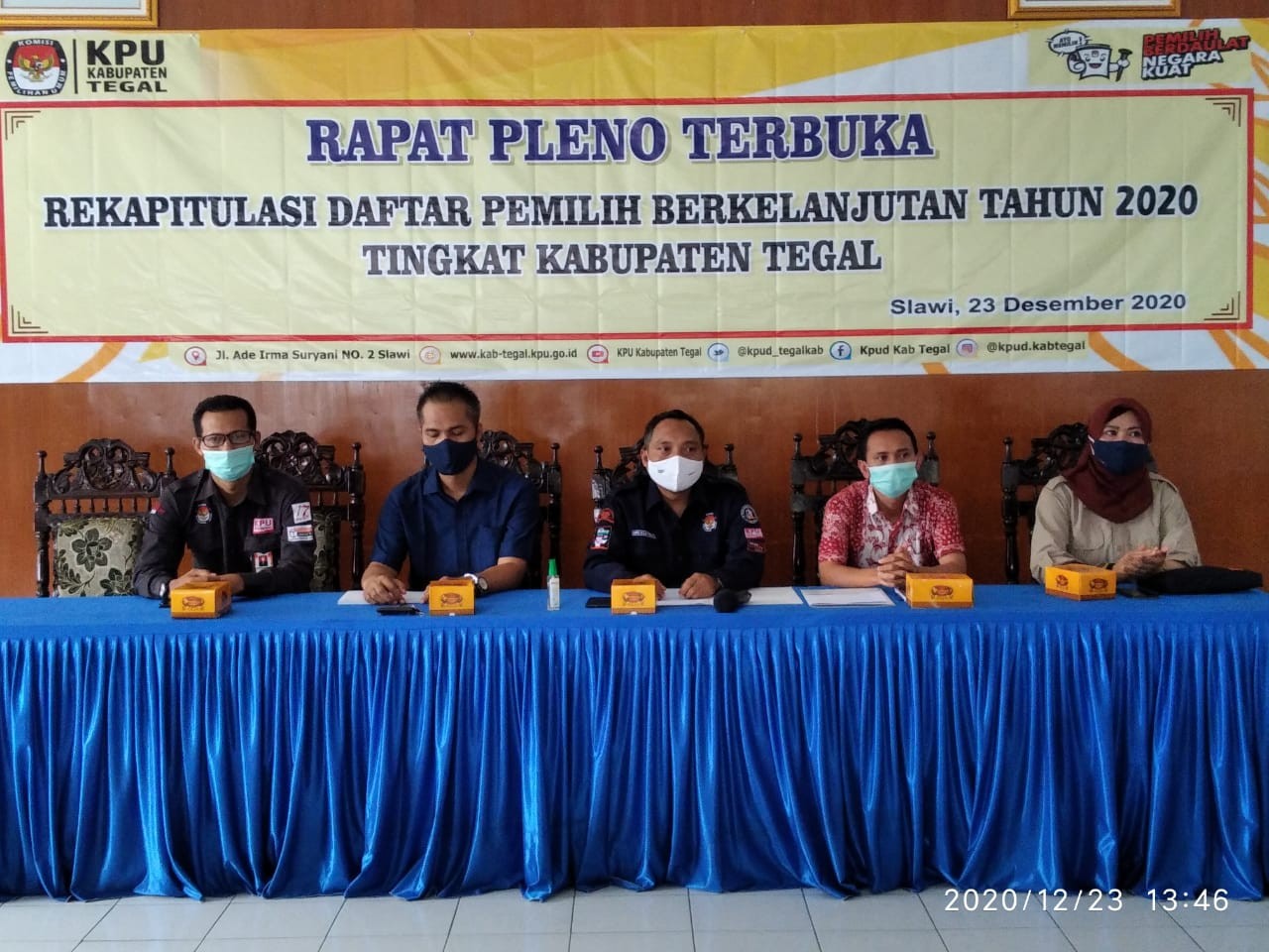 Slawi – hari rabu (23/12/2020) kembali KPU Kabupaten Tegal laksanakan Rapat Pleno Terbuka Rekapitulasi Pemutakhiran Data Pemilih Berkelanjutan (PDPB) periode bulan November 2020. Acara digelar di gedung PKK Slawi pukul 10 pagi. Hadir dalam acara ini Ketua dan Anggota KPU Tegal, Bawaslu Kabupaten Tegal, Polres Tegal, Kodim 0712 Tegal, Kabag Pemeintahan setda Kabupaten Tegal, Disdukcapil Kabupaten Tegal, Kemenag Kabupaten Tegal, dan Pimpinan Partai Politik peserta pemilu 2019.