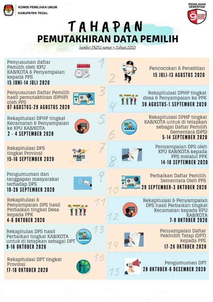 Slawi – Mekipun Komisi Pemilihan umum Kabupaten Tegal tidak melaksanakan tahapan pemilihan 2020, namun dalam rangka Pendidikan Politik, KPU Kabupaten Tegal melalui Infografis mengajak masyarakat Kabupaten Tegal mengetahui tahapan Pemutakhiran Daftar Pemilih dalam Pemilihan 2020. Peraturan KPU Nomor 5 Tahun 2020 telah mengatur Jadwal Pemutakhiran daftar dan data pemilih tersebut. Berikut Info grafis tahapannya.