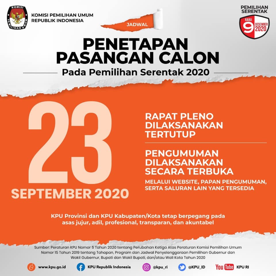 Slawi – Meskipun Kabupaten Tegal tidak sedang melaksanakan #pemilihanserentak2020, berdasarkan Peraturan KPU Republik Indonesia Nomor 5 Tahun 2020 tentang perubahan ketiga PKPU Nomor 15 tahun 2019 tentang Tahapan, Program dan Jadwal Penyelenggaraan Pemilihan Gubernur dan wakil Gubernur, Bupati dan wakil Bupati serta walikota dan Wakil Walikota Tahun 2020, hari Rabu, (23/09/2020) adalah tahapan “Penetapan Calon, dan esok hari Kamis (24/09/2020) memasuki tahapan Pengundian Nomor Urut.”. Untuk itu kepada pendukung calon dimanapun mohon tetap #patuhiketentuan dan #patuhiprotokolkesehatan#gunakanmasker#selalucucitangan#jagajarak#hindarikerumunan dan tentunya tidak melakukan euforia berlebihan agar tidak menciptakan cluster baru penyebaran #covid19. Untuk lebih jelasnya bisa dilihat info grafis dibawah ini.