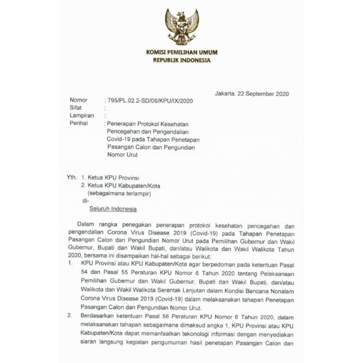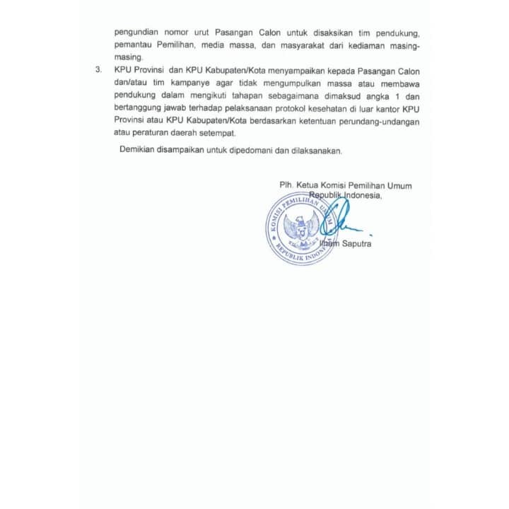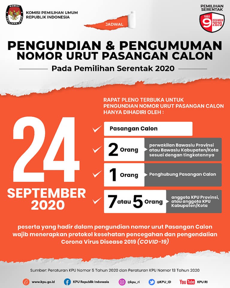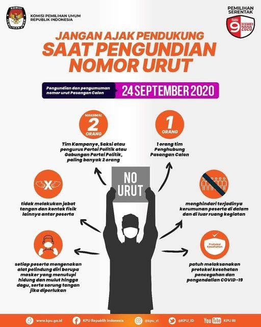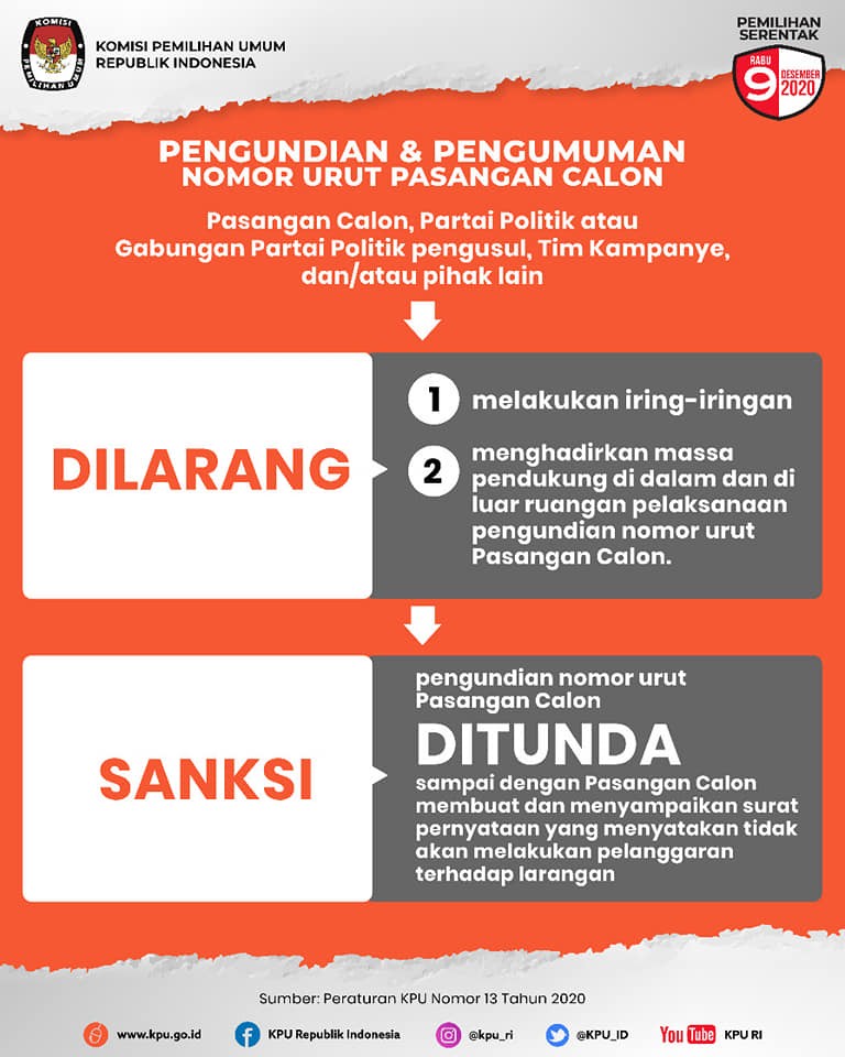 KPU juga telah mengatur larangan serta sanksi untuk tahapan Pengundian & Pengumuman Nomor Urut Paslon #Pemilihan2020 yang tertuang dalam PKPU 13 Tahun 2020.Ini merupakan bentuk komitmen KPU guna menjamin keselamatan dan kesehatan semua pihak dimasa pandemi. (Fas)
