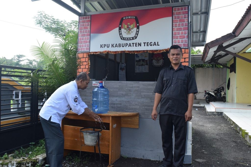 WWW.kab-tegal.kpu.go.id. Dalam rangka menghadapi pandemi corona { covid 19 } yang semakin mewabah, KPU Kabupaten Tegal melaksanakan ketentuan yang telah ditetapkan oleh pemerintah pusat, bahwasannya setiap instansi perkantoran wajib menyediakan tempat cuci tangan beserta sabun cuci tangan sebelum masuk lingkungan kantor, Begitu juga dengan KPU Kab Tegal, setiap tamu yang datang dan berkunjung masuk kelingkungan Kantor KPU Kab Tegal juga diharuskan memakai masker pelindung.