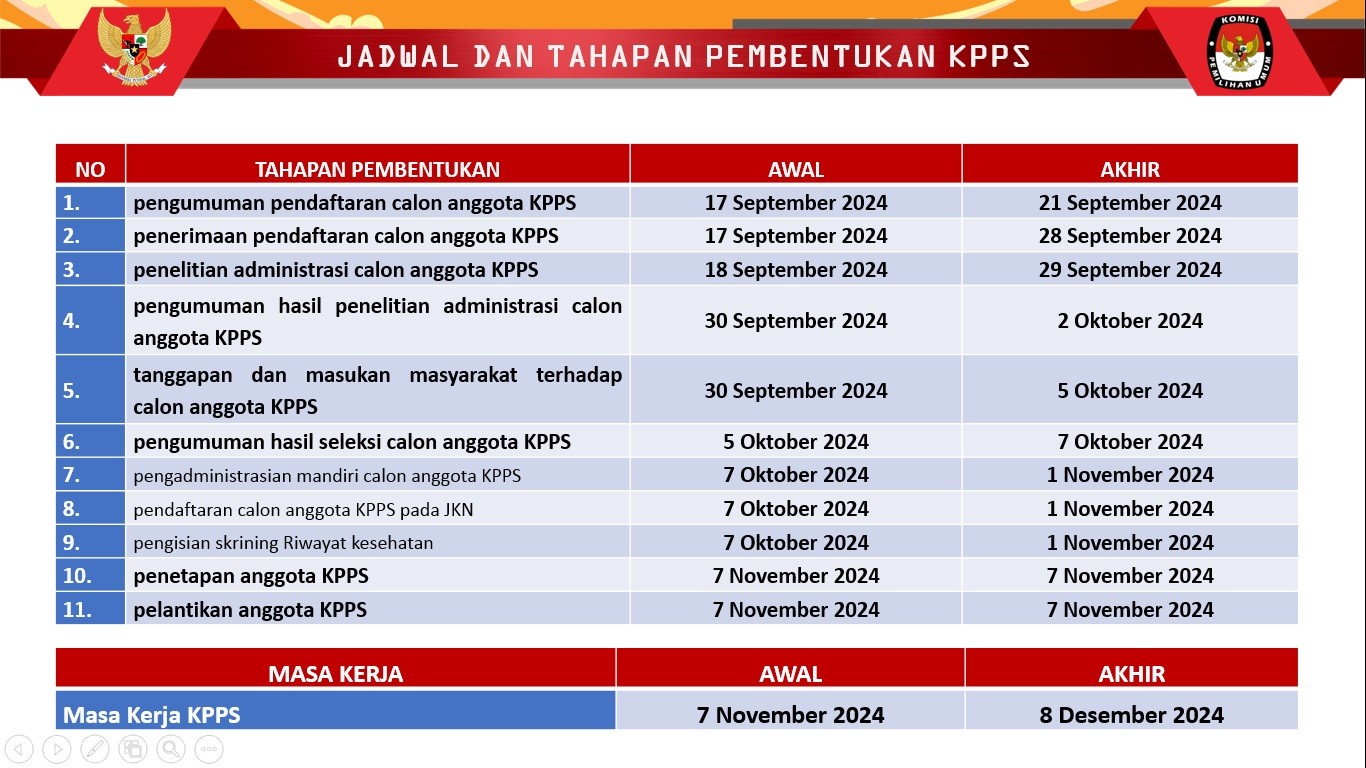 - Pengumuman hasil seleksi calon anggota KPPS: Tanggal 5-7 Oktober 2024