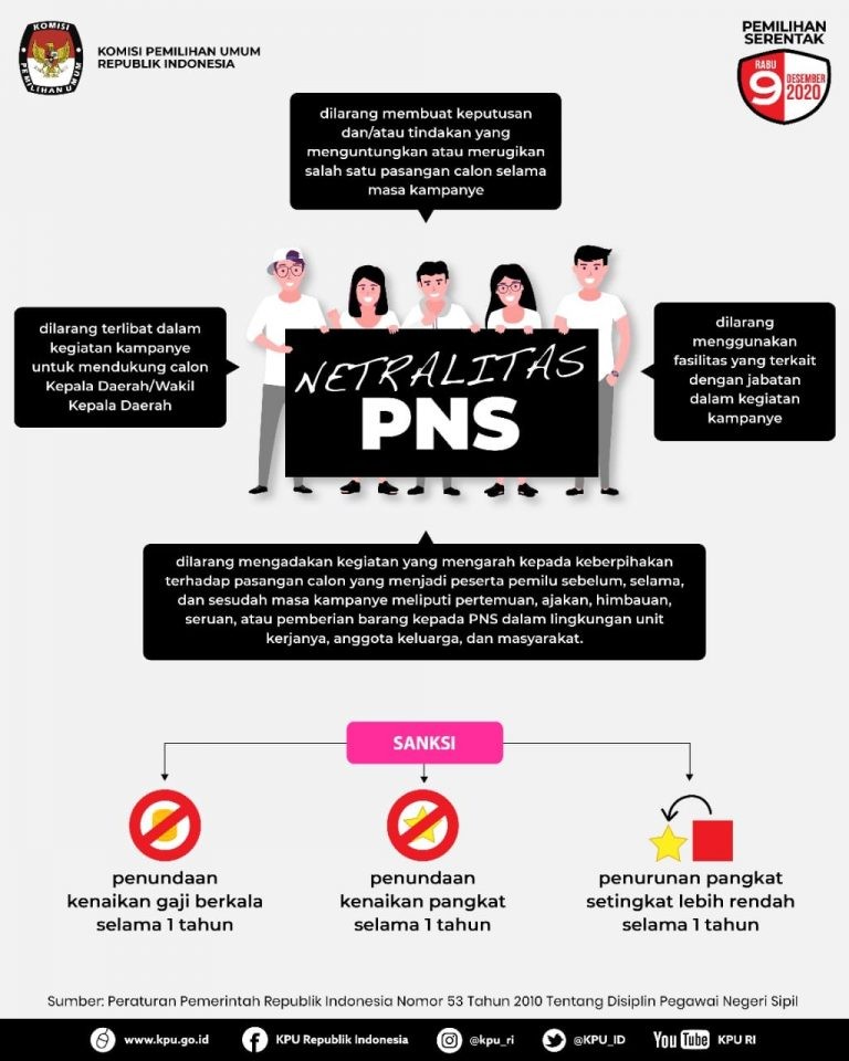 Slawi – Sesuai Peraturan Pemerintah RI No 53 Tahun 2010 ttg Disiplin Pegawai Negeri Sipil (PNS), sebagai PNS maka sudah sepatutnya untuk tetap netral dimasa pemilu/pemilihan Berikut aturan lengkapnya. (Fas)
