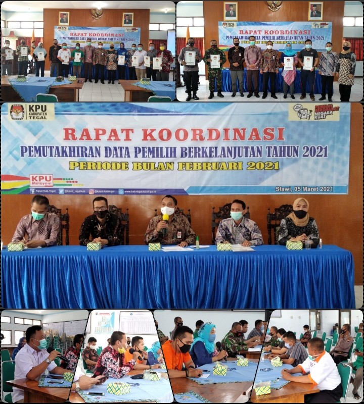 Dalam rapat koordinasi ini, dibacakan hasil Pemutakhiran Data Pemilih Berkelanjutan periode bulan pebruari tahun 2021 oleh Adi Purwanto selaku anggota KPU Kabupaten Tegal divisi Perencanaan, data dan info. Adapun rinciannya sebagai berikut, jumlah potensi pemilih baru laki-laki sejumlah 453 (empat ratus enam lima puluh tiga) orang dan perempuan sejumlah 408 (empat ratus delapan) orang dengan jumlah total 861(delapan ratus enam puluh satu) orang, sedangkan potensi pemilih tidak memenuhi syarat (TMS) laki-laki sejumlah 186 (seratus delapan puluh enam) orang dan perempuan sejumlah 133 (seratus tiga puluh tiga) orang dengan jumlah total 319(tiga ratis sembilan belas) orang, sehingga untuk Daftar Pemilih Berkelanjutan periode bulan pebruari 2021 berjumlah 1.220.641 orang yang terdiri dari laki-laki sebanyak 618.142 orang dan perempuan sebanyak 602.499 orang
