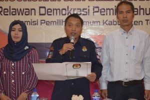 Slawi, kpu.go.id – Komisi Pemilihan Umum Kabupaten telah telah mengukuhkan 55 relawan demokrasi untuk bersama-sama terjun ke masyarakat dalam rangka ikut menyosialisasikan Pemilu 2019. Mereka juga telah menandatangani pakta integritas sebagai relawan, sekaligus siap mematuhi kode etik dengan menjaga independensi, imparsial, nonpartisan, serta berkomitmen membantu upaya meningkatkan partisipasi dan kualitas demokrasi dan pemilu 2019.