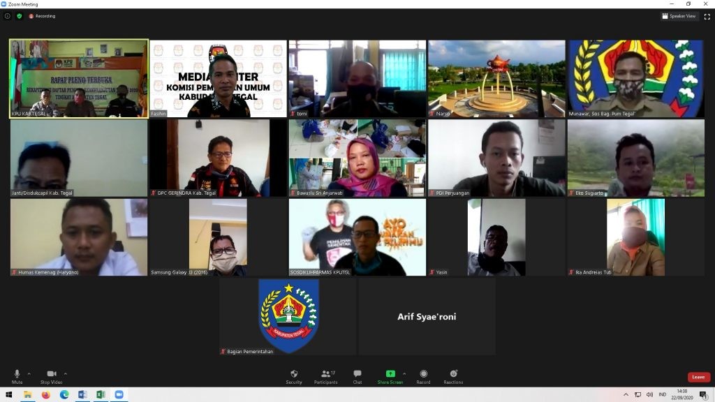 Slawi – Pada hari Selasa, tanggal dua puluh dua bulan September tahun dua ribu dua puluh pukul 14.00 WIB KPU Kabupaten Tegal melaksanakan Rapat Pleno Rekapitulasi Pemutakhiran Data Pemilih Berkelanjutan periode bulan Agustus Tahun 2020 melalui Aplikasi Zoom Meeting. Rapat dipimpin langsung oleh ketua KPU Kabupaten Tegal, Bp. Nurokhman beserta komisioner KPU Kabupaten Tegal. Hadir dalam acara ini Anggota Komisioner Bawaslu, Polres, Kabag Pemerintahan Pemda, Disdukcapil, segenap pimpinan Partai politik peserta pemilu Kabupaten Tegal.