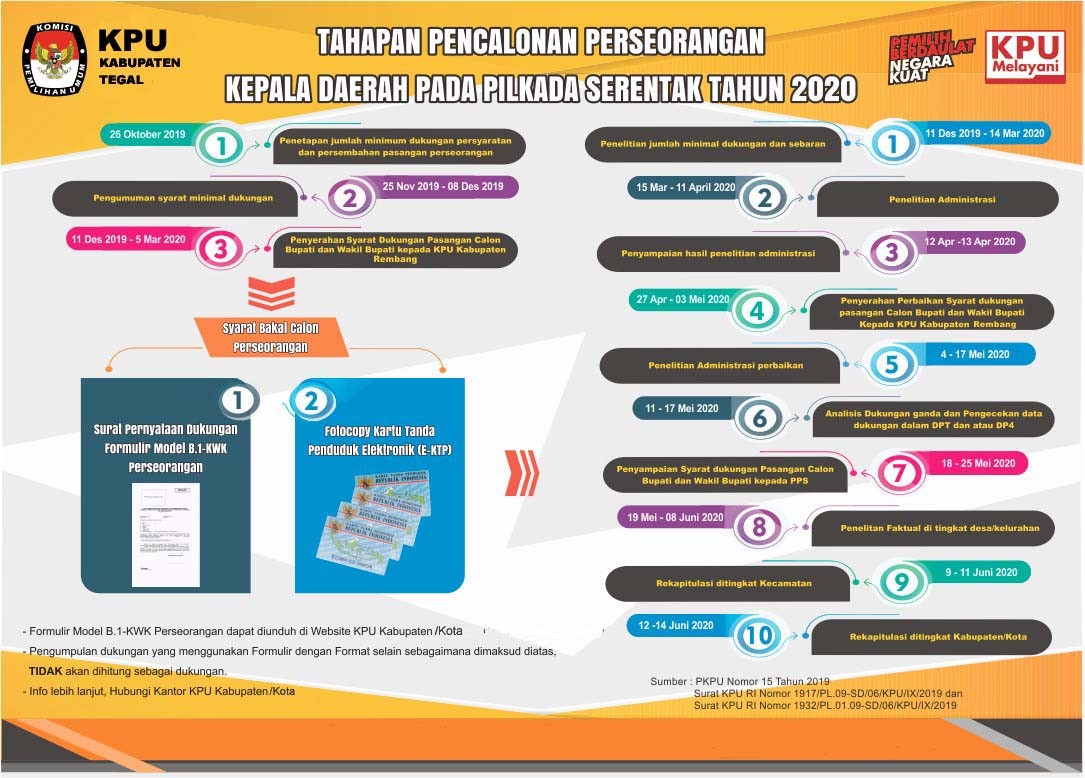 Slawi – Dalam rangka Pendidikan Politik, Komisi Pemilihan umum Kabupaten Tegal mengajak masyarakat Kabupaten Tegal untuk mengenali Tahapan Pencalonan Perseorangan (biasa dikenal Calon Independen) dalam Pemilihan 2020. Tahapan ini berdasar PKPU nomor 15 tahun 2019, Surat KPU RI nomor 1917/PL.09-SD/06/KPU/IX/2019 dan nomor 1932/PL.01.09-SD/06/KPU/IX/2019 tertuang sebagaimana infografis berikut.
