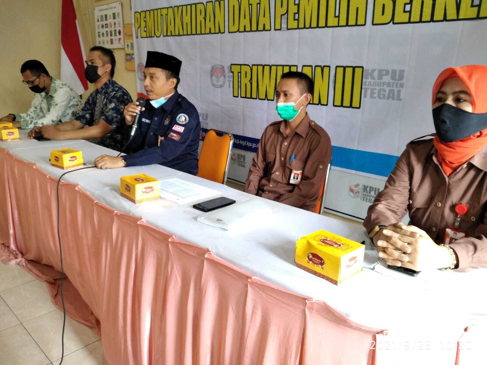 Slawi - Komisi Pemilihan Umum (KPU) Kabupaten Tegal gelar Rapat Koordinasi Pemutakhiran Data Pemilih Berkelanjutan Triwulan III periode September Tahun 2021, Selasa (28/09/2021) di Aula Rumah Pintar Pemilu (RPP) KPU KabupatenTegal. Pemutakhiran data pemilih berkelanjutan ini digelar setiap bulan menggandeng stakeholder (pemangku kepentingan) terkait, seperti Badan Pengawas Pemilu (Bawaslu) Kab.Tegal Polres Tegal, Kodim 0712, Disdukcapil, Pengadilan Negeri, Kesbangpolinmas, Kabagpem Setda Tegal, dan pimpinan Partai Politik peserta Pemilu 2019. Kegiatan ini merupakan tindak lanjut Surat KPU RI Nomor 366/PL.02-SD/01/KPU/IV/2021 perihal perubahan Surat KPU Nomor 132/PL.02-SD/01/KPU/II/2021 perihal Pemutakhiran Data Pemilih Berkelanjutan Tahun 2021. KPU berkewajiban melakukan pemutakhiran dan memelihara data pemilih berkelanjutan secara berkala dengan memperhatikan data kependudukan sesuai ketentuan peraturan perundang- undangan. Pelaksanaan rapat koordinasi kemudian dipandu Adi Purwanto Anggota KPU Kabupaten Tegal Divisi Perencanaan Data dan Informasi dengan membacakan hasil pemutakhiran data pemilih berkelanjutan untuk periode september 2021. “Dapat diketahui bahwa data Data Pemilih Berkelanjutan (DPB) bulan sebelumnya sebanyak 1.224.357 pemilih. Untuk DPB Periode September Tahun 2021 terdapat potensi pemilih baru yang bersumber dari Disdukcapil Tegal sebanyak 34 pemilih dengan rincian Laki-laki 16 pemilih, Perempuan 18 pemilih kemudian Tidak Memenuhi Syarat (TMS) diperoleh data sebanyak 75 pemilih. Maka diketahui untuk Data Pemilih Berkelanjutan (DPB) Periode September 2021 sebanyak 1.224.316 pemilih yang terdiri dari pemilih laki- laki sebanyak 619.987 dan pemilih perempuan sebanyak 604.329 pemilih,” ungkap Adi Purwanto, Anggota KPU Kabupaten Tegal Divisi Perencanaan Data dan Informasi. Hasil dari proses kegiatan pemutakhiran disusun dalam form rekapitulasi. Selanjutnya disampaikan ke semua pihak dalam rapat koordinasi dimana rapat dituangkan dalam berita acara Nomor : 19/PL.02.1-BA/3328/KPU-Kab/IX/2021 tentang Rapat Koordinasi Data Pemilih Berkelanjutan Tahun 2021 Triwulan III. Perlu diketahui, hasil pemutakhiran ini juga diumumkan di papan pengumuman KPU Kabupaten Tegal dan Website KPU Kabupaten Tegal sehingga dapat diakses oleh masyarakat secara mudah. KPU Kabupaten Tegal juga membuka layanan di kantor pada jam operasional mulai pukul 08.00 s.d 16.00 WIB dan untuk layanan online, masyarakat bisa langsung mengakses website KPU Kabupaten Tegal. kemudian masyarakat bisa memberi tanggapat terkait data kependudukan tersebut. (Win) Berita Acara Data Pemilih Berkelanjutan Download By Name Data Pemilih Berkelanjuta Download Ikuti juga : ---------------------------- ?Komisi Pemilihan Umum Kab. Tegal ?Laman : https://kab-tegal.kpu.go.id ?Facebook : KPUD Kabupaten Tegal ?Twitter : @kpud_tegalkab ?Instagram : @kpud.kabtegal ? Youtube : KPU Kabupaten Tegal ? Surel : kpud.kabtegal@gmail.com #KPUmelayani