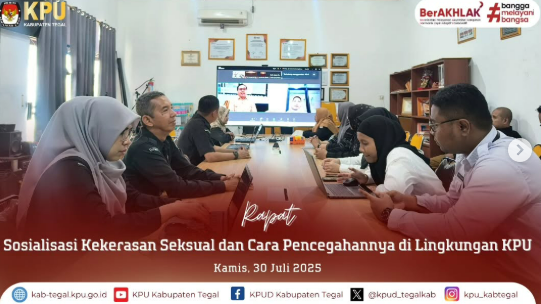 Slawi- KPU Kabupaten mengikuti kegiatan Sosialisasi Pencegahan Kekerasan Seksual di Lingkungan KPU Provinsi Jawa Tengah dan KPU Kabupaten/Kota se-Jawa Tengah melalui zoom meeting, Rabu (30/7/2025)