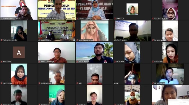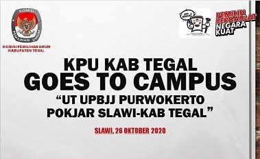 Slawi – Rabu (21/12/2020) Komisi Pemilihan Umum Kabupaten Tegal melakukan kegiatan KPU Goes to Campus, dan kali ini adalah kampus Politeknik Bhakti Praja (BAJA) Tegal . Acara ini merupakan yang ke empat kalinya dilakukan oleh KPU Kabupaten Tegal dalam bentuk Webinar yang dimaksudkan untuk meminimalisir resiko penyebaran virus covid-19. Sosialisasi diikuti oleh Mahasiswa dan Dosen Politeknik BAJA Tegal yang sebelumnya mendaftarkan secara online sebelum pelaksanaan kegiatan. Ketua KPU Kabupaten Tegal, Nurokhman dalam sambutannya menyampaikan apresiasi kepada Politeknik BAJA Tegal atas kerjasamanya dalam pelaksanaan kegiatan Webinar ini, bicara demokrasi dan kedaulatan rakyat, maka menjadi kewajiban negara yang demokratis untuk melaksanakan pemilu yang tujuannya untuk memilih pemimpin/pejabat eksekutif maupun legislatif, dalam pemilu tentunya partisipasi penggunaan hak pilih akan menjadi penting karena akan berpengaruh dalam kebjakan negara/daerah selama lima tahun kedepan, kami berharap adik-adik mahasiswa serta seluruh civitas akademika poiteknik BAJA Tegal akan menjadi mitra KPU kabupaten Tegal dalam pendidikan politik masyarakat Tegal khususnya agar partisipasi dalam pemilu/pemilihan semakin baik. Sosialisasi KPU Goes to School kali ini menghadirkan 3 narasumber , yakni Adi Purwanto, ST. dari KPU Kabupaten Tegal. Istibsaroh, S.E dari Bawaslu Kabupaten Tegal, dan DR. Indaru S. Nuroprojo (Ketua jurusan ilmu Politik Fisip Unsoed Purwokerto). (Fas) Proses Webinar KPU kabupaten Tegal Goes To Campus Politeknik BAJA Tegal selengkapnya dapat dilihat di kanal youtube KPU Kabupaten Tegal dengan link berikut : https://www.youtube.com/watch?v=azkw2WGR5Hs&t=556s