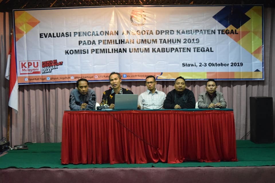 kab-tegal.kpu.go.id. Komisi Pemilihan Umum (KPU) Tegal gelar evaluasi pencalonan anggota DPRD Kabupaten Tegal Pemilu tahun 2019. Dalam evaluasi yang dilaksanakan di Hotel Duta Wisata-Guci Tegal, Rabu-Kamis (2-3/10/2019). Hadir dalam kegiatan ini Ketua dan anggota KPU Kabupaten Tegal, Segenap Pejabat struktural sekretariat KPU Kabupaten Tegal, Pimpinan dan LO partai politik peserta pemilu 2019, Polres, Disdukcapil, Kabagpem Pemda Tegal.