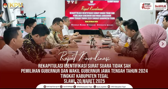 Slawi- KPU Kabupaten Tegal menggelar Rapat Koordinasi Rekapitulasi Identifikasi Surat Suara Tidak Sah Pemilihan Gubernur dan Wakil Gubernur Jawa Tengah Tahun 2024 Tingkat Kabupaten Tegal di Ruang RPP, Kantor KPU Kabupaten Tegal, Kamis (20/03/2025). Rakor tersebut dihadiri oleh Ketua dan Anggota KPU Kabupaten Tegal, seluruh pegawai Sekretariat KPU Kabupaten Tegal, serta Kesbangpol Kabupaten Tegal. Dalam sambutanya Himawan menyampaikan bahwa ini pertama kalinya dilakukan identifikasi surat suara tidak sah pada Pilkada dari tingkat Kecamatan ,Desa sampai TPS. Hasil identifikasi surat suara tidak sah untuk kategori tidak tercoblos dan tercoblos lebih dari satu kali cukup besar jumlahnya, hal ini menjadi bahan evaluasi bagi kita untuk penyelenggaraan pilkada selanjutnya. “Hasil identifikasi ini untuk dipublikasikan sebagai bahan evaluasi dan juga riset/ penelitian pihak lain yang membutuhkan.”ucap Himawan. Rakor kemudian dilanjutkan pemaparan materi oleh divisi Teknis, Adi Purwanto dan dilanjutkan dengan sesi pemberian saran dan masukan dari peserta yang hadir.