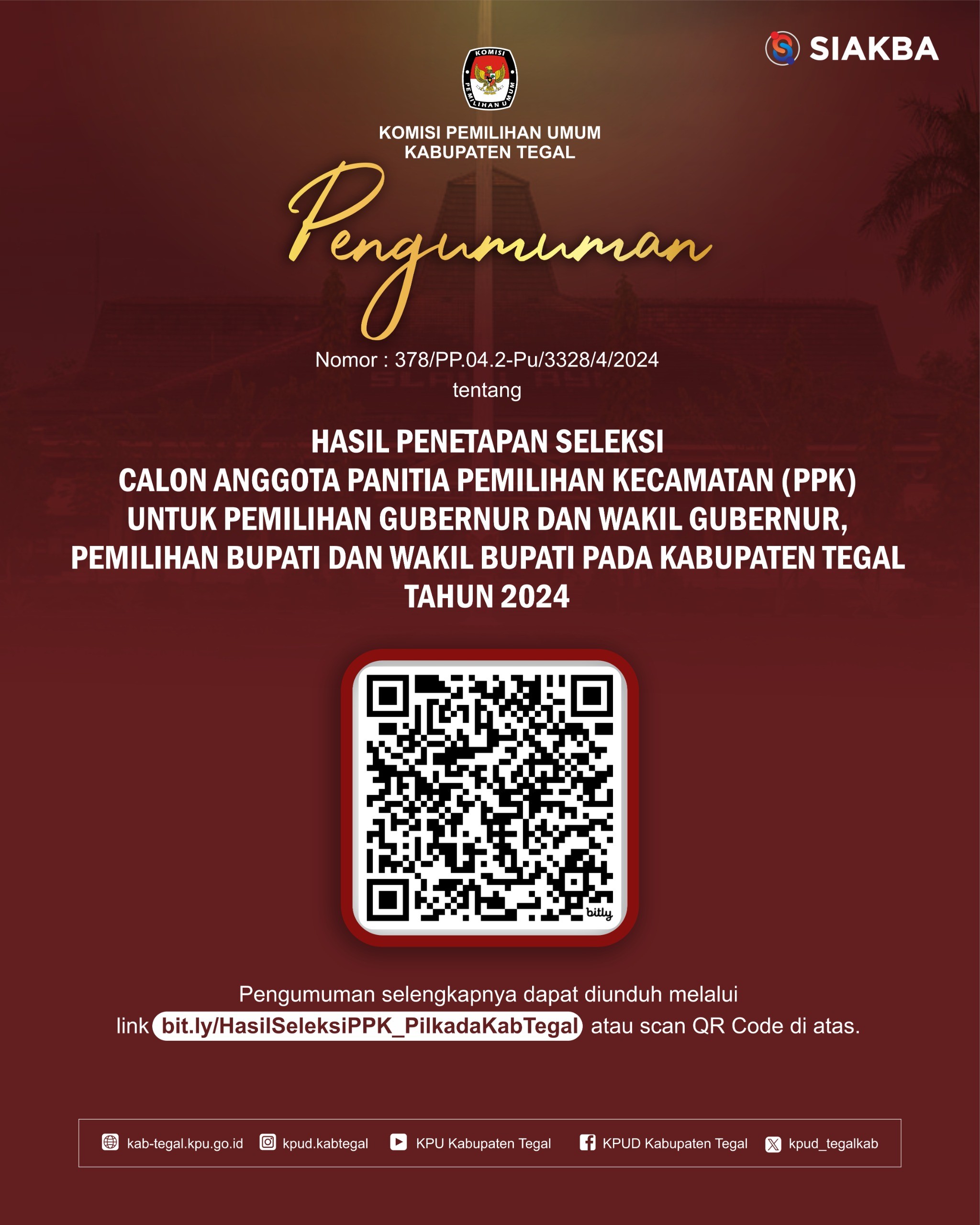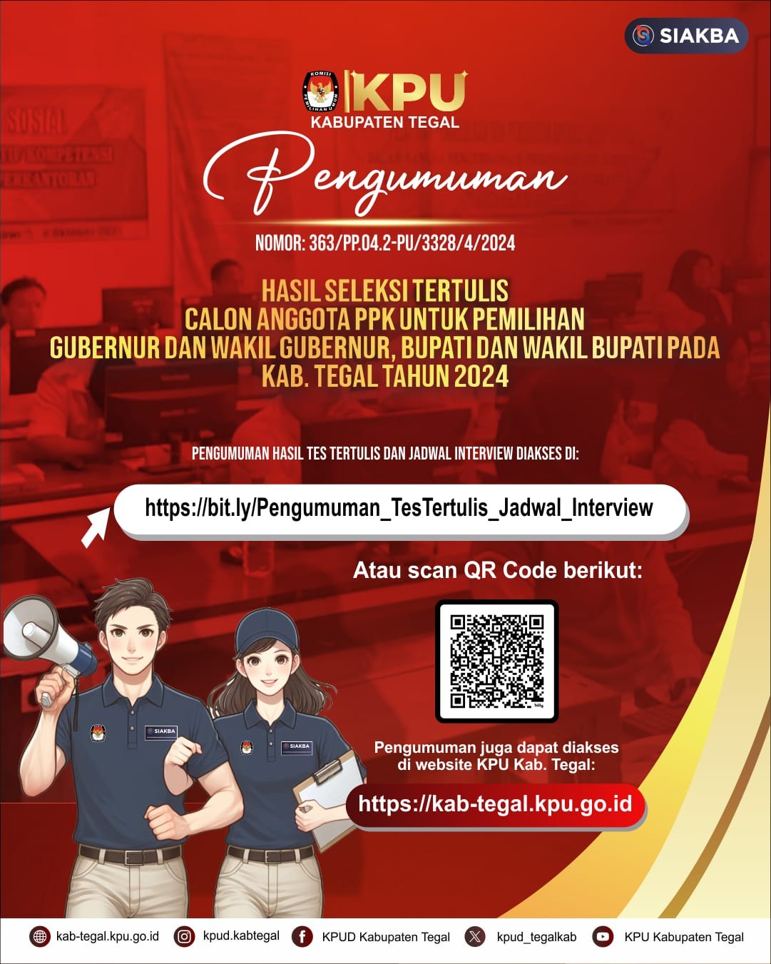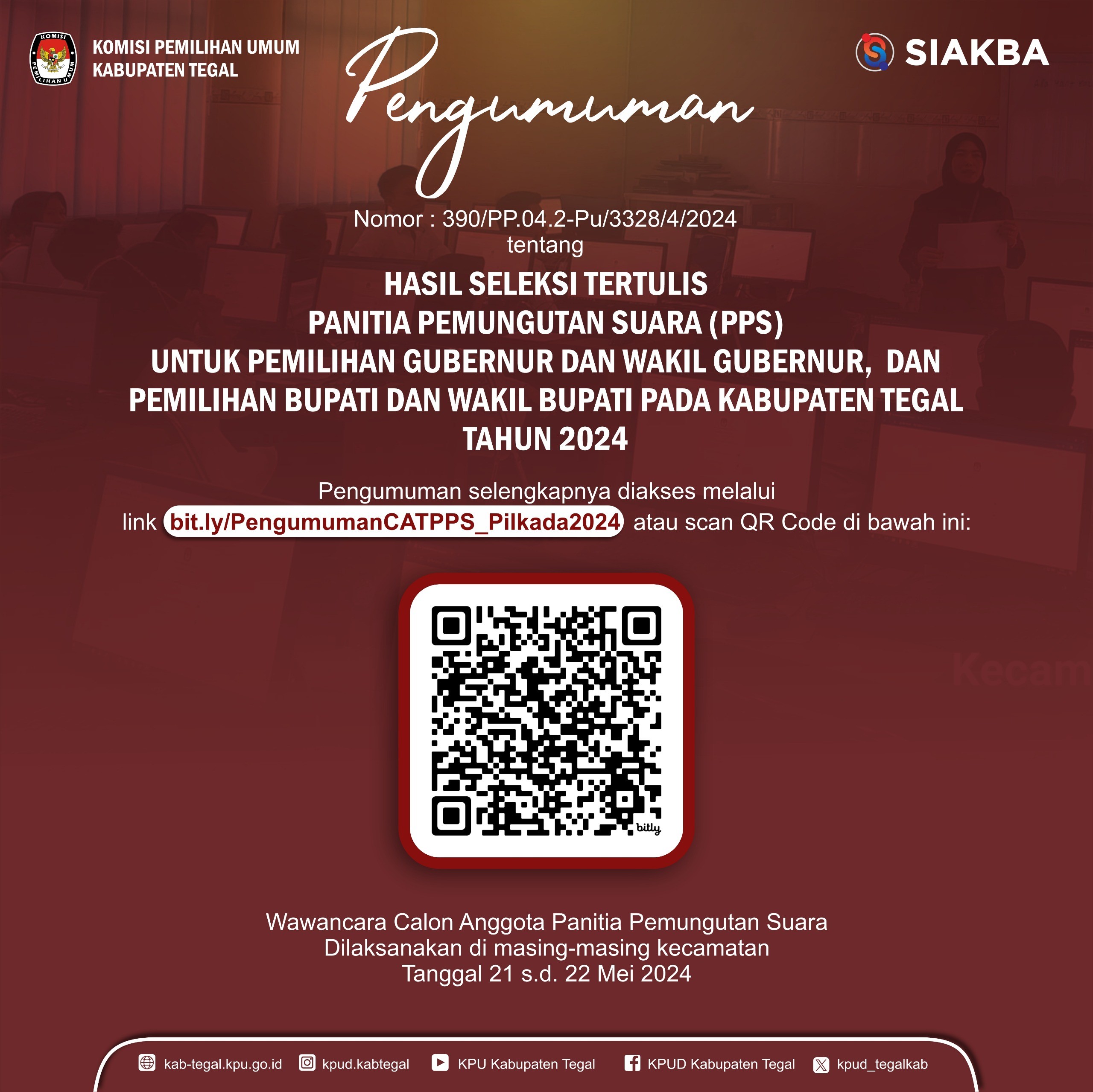Pengumuman Hasil Seleksi Tertulis dan Jadwal Pelaksanaan Seleksi Wawancara Calon Anggota Panitia Pemilihan Kecamatan Untuk Pemilihan Gubernur dan Wakil Gubernur, Bupati dan Wakil Bupati Pada Kabupaten Tegal Tahun 2024.
