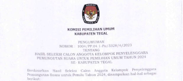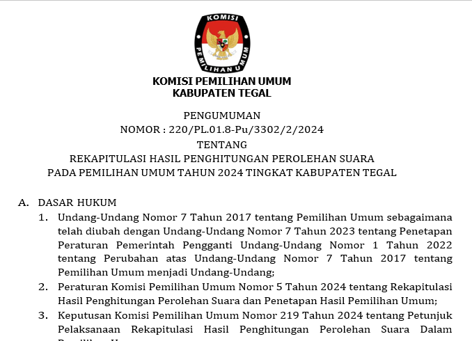 Rekapitulasi Hasil Penghitungan Perolehan Suara Pemilu Tahun 2024 tingkat Kabupaten Tegal :