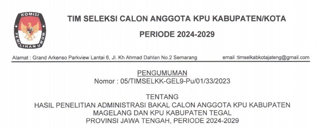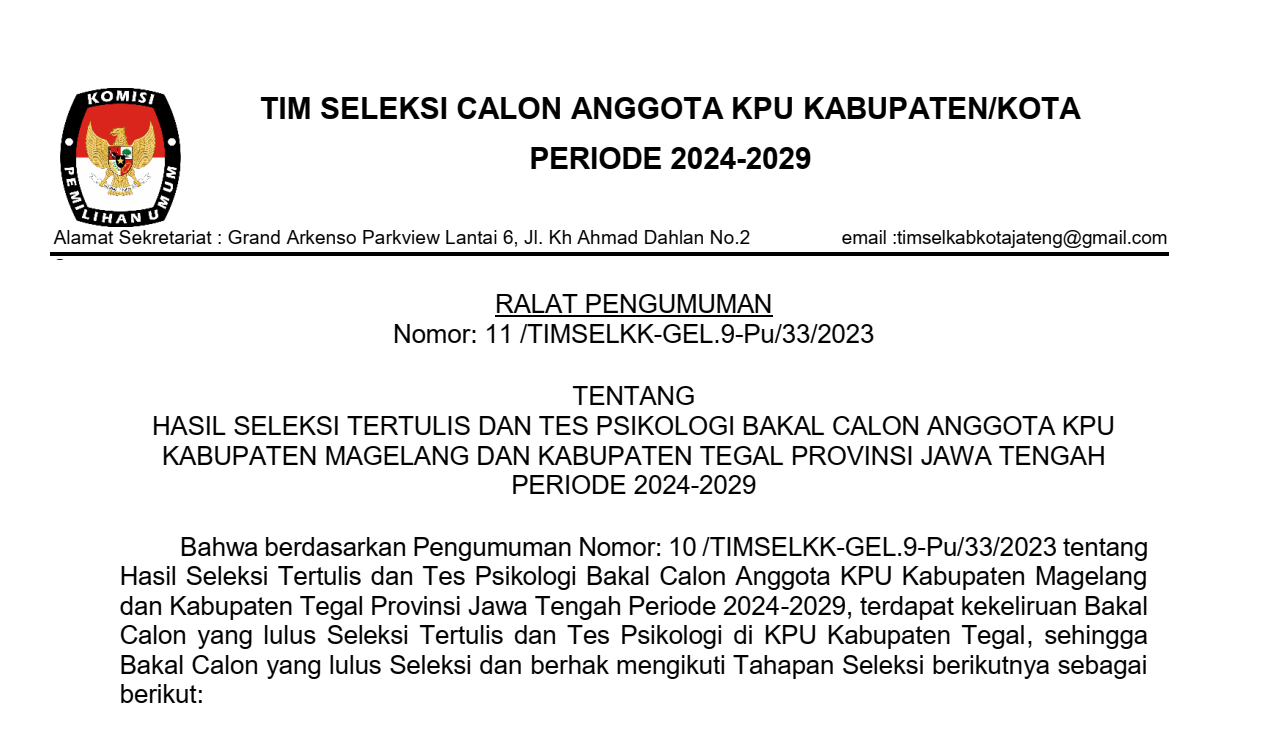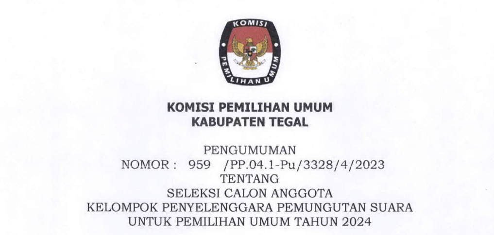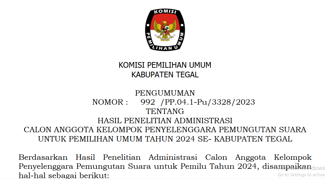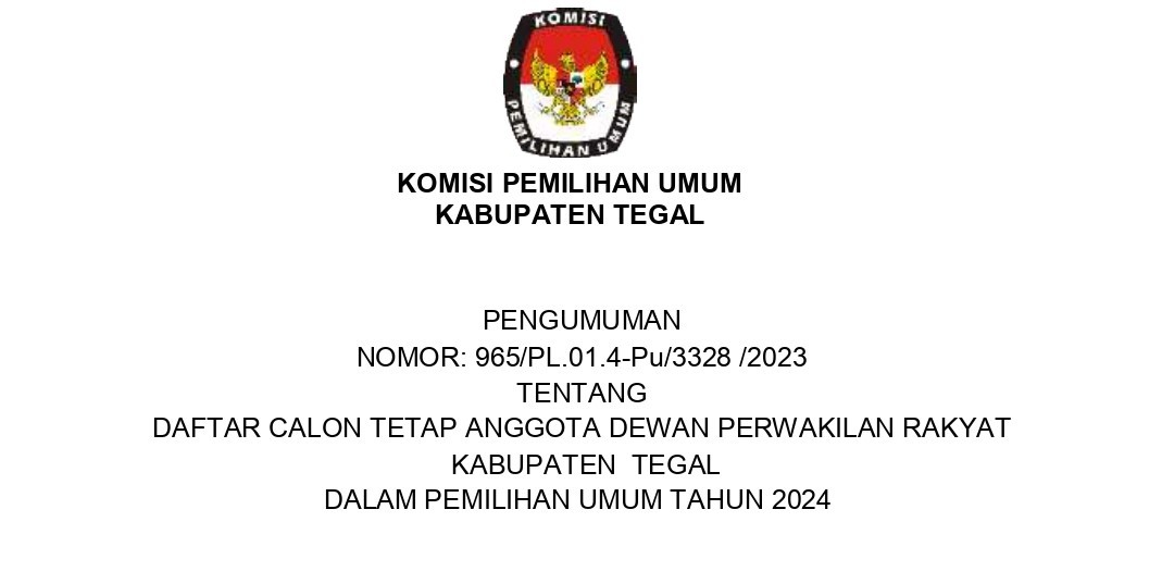 Bahwa untuk melaksanakan ketentuan Pasal 85 ayat (1) Peraturan KPU Nomor 10 Tahun 2023 tentang Pencalonan Anggota Dewan Perwakilan Rakyat, Dewan Perwakilan Rakyat Daerah Provinsi, dan Dewan Perwakilan Rakyat Daerah Kabupaten/Kota dan berdasarkan Keputusan Komisi Pemilihan Umum Kabupaten Tegal Nomor 460 Tahun 2023 tentang Daftar Calon Tetap Anggota Dewan Perwakilan Rakyat Kabupaten Tegal Dalam Pemilihan Umum Tahun 2024 tanggal 3 November 2023, Komisi Pemilihan Umum mengumumkan Daftar Calon Tetap (DCT) Anggota Dewan Perwakilan Rakyat Daerah Kabupaten Tegal dan persentase keterwakilan perempuan dalam DCT sebagaimana terlampir. Data lengkap calon tetap Anggota DPRD Kabupaten Tegal dapat dilihat melalui portal publikasi https://infopemilu.kpu.go.id/Pemilu.
