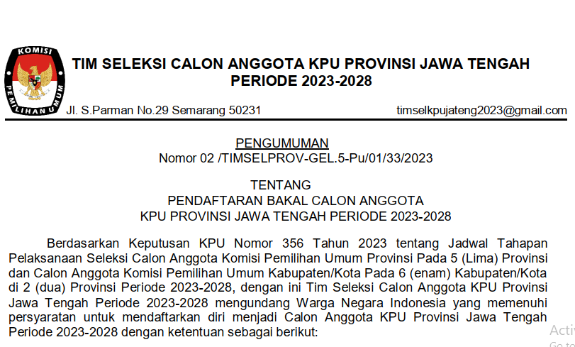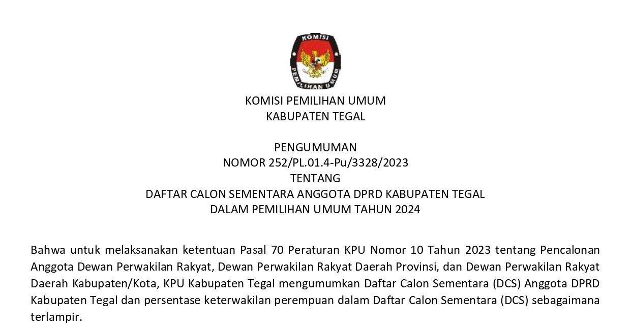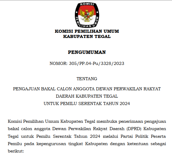 Slawi- Komisi Pemilihan Umum (KPU) Kabupaten Tegal mengumumkan Daftar Calon Sementara (DCS) Anggota Calon Dewan Perwakilan Rakyat Daerah (DPRD) Kabupaten Tegal untuk Pemilu tahun 2024. DCS akan diumumkan selama 5 hari mulai tanggal 19 sampai dengan 23 Agustus 2023. Pengumuman DCS dapat juga dilihat di koran Suara merdeka dan Radar Tegal serta media online seperti: Ayo Tegal, Tribun Pantura, Pantura Post, dan Radar Tegal.