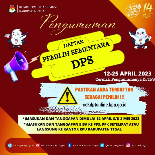 Masyarakat Kabupaten Tegal dapat memberikan masukan dan tanggapan terhadap nama Bakal Calon Anggota DPRD Kabupaten Tegal dalam DCS mulai tanggal 19 sampai dengan 28 Agustus 2023 dengan cara mengakses website infopemilu.kpu.go.id atau melalui surat yang dikirim ke KPU Kabupaten Tegal.