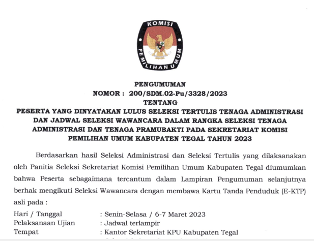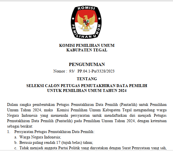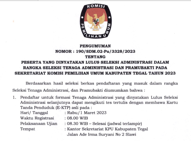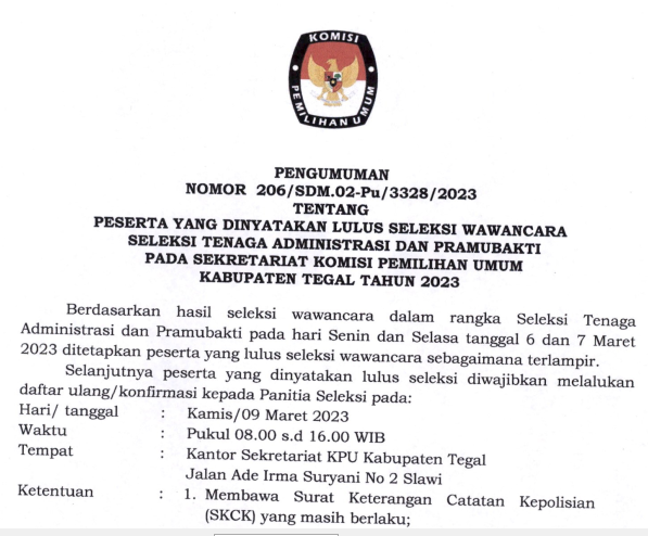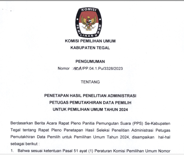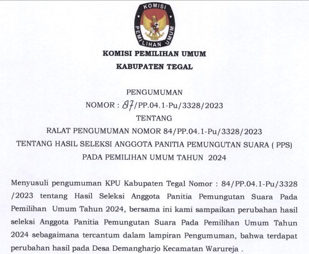 Menyusuli pengumuman KPU Kabupaten Tegal Nomor : 84/PP.04.1-Pu/3328 /2023 tentang Hasil Seleksi Anggota Panitia Pemungutan Suara Pada Pemilihan Umum Tahun 2024, bersama ini kami sampaikan perubahan hasil seleksi Anggota Panitia Pemungutan Suara Pada Pemilihan Umum Tahun 2024 sebagaimana tercantum dalam lampiran Pengumuman, bahwa terdapat perubahan hasil pada Desa Demangharjo Kecamatan Warureja.